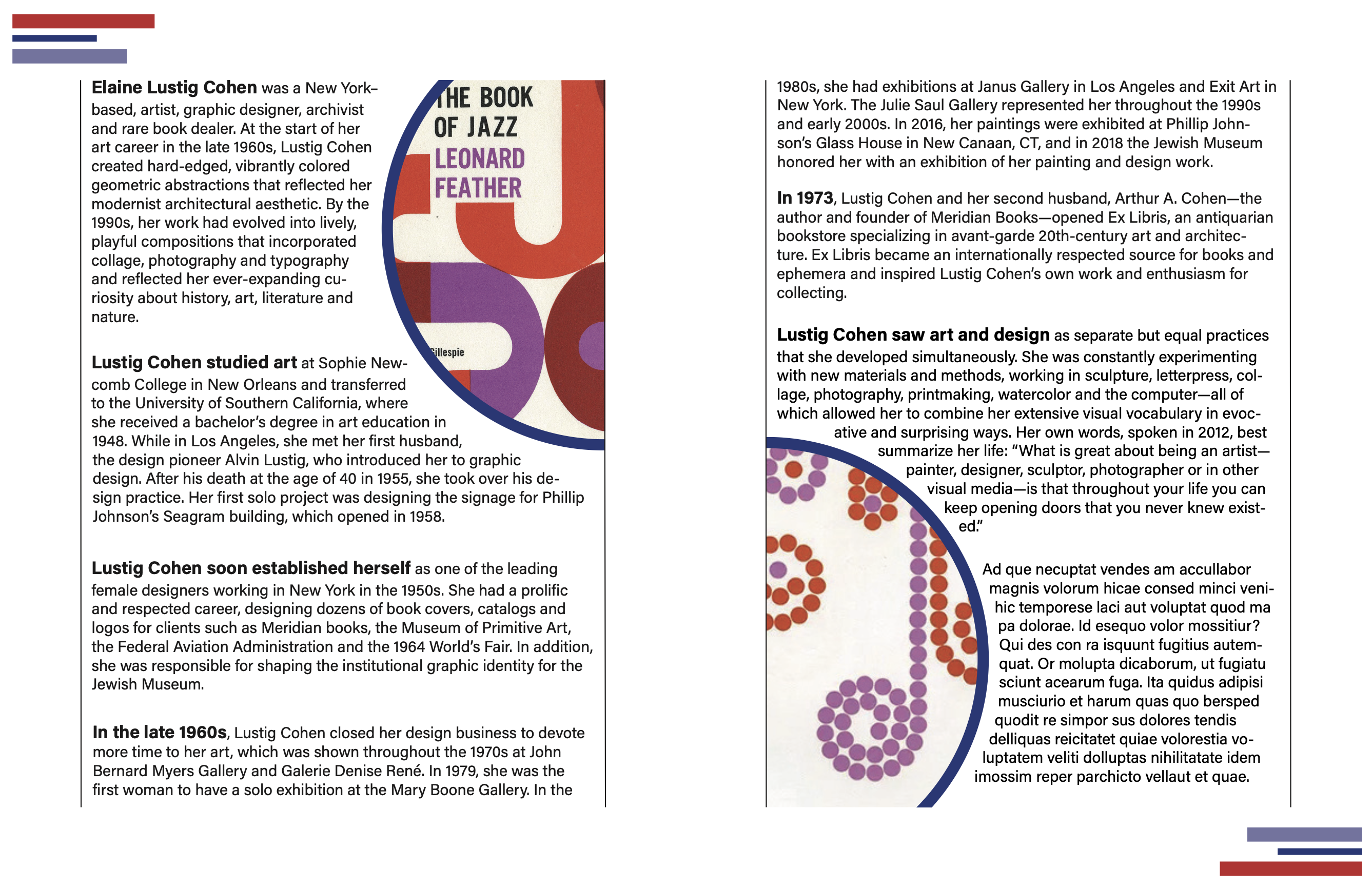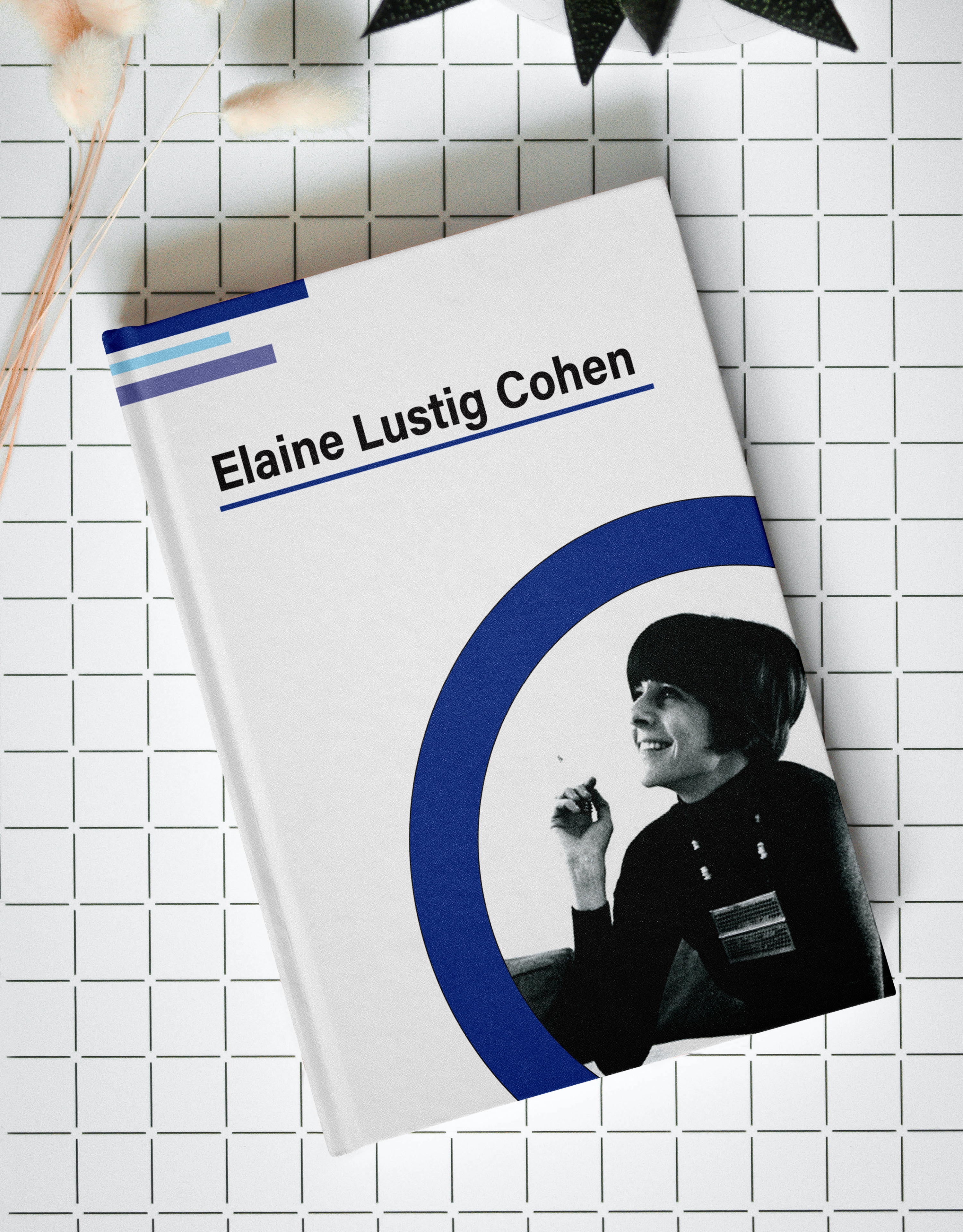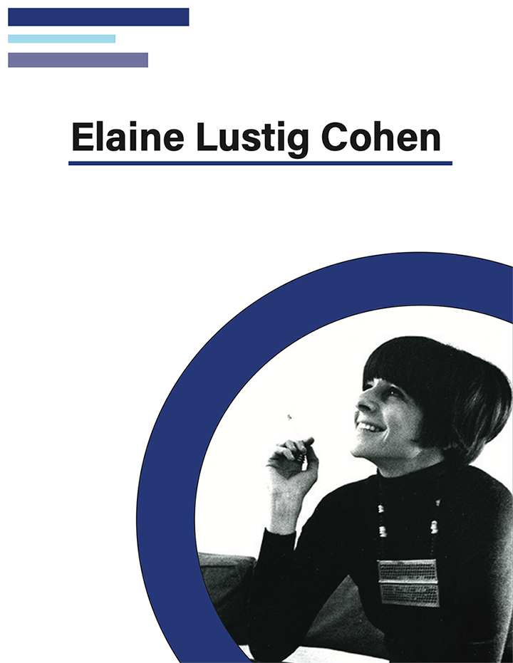 For the front page of the magazine, a picture of Elaine Cohen is embedded in a circle that's cutting off the page, in order to convey a lively and playful design style.