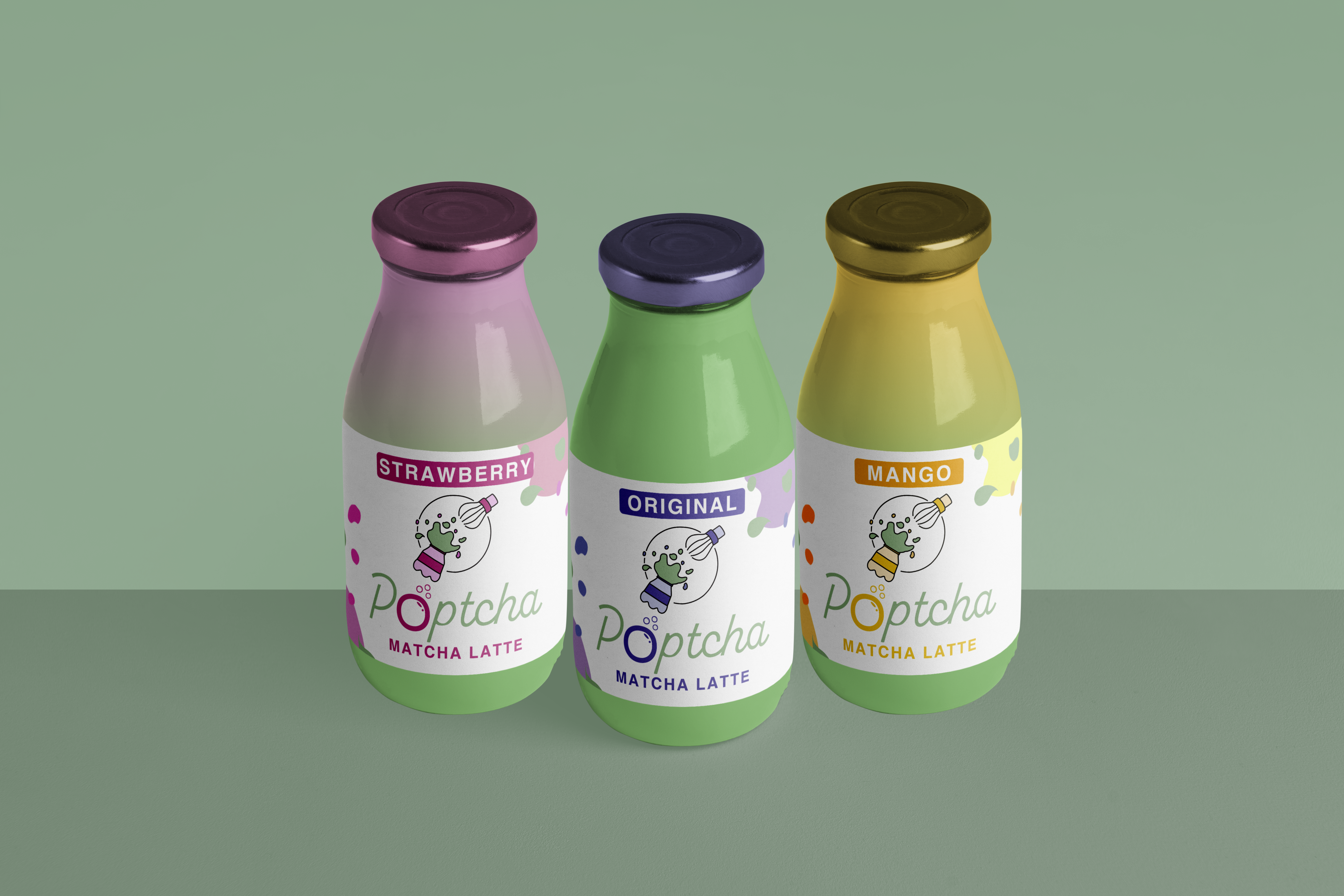 The final design overall has eye catching elements and colors that easily stand out, and portray the brand's ideation of fun flavored matcha products. The logo is also easily adaptable to represent different flavors of the matcha products by changing the secondary colors.
